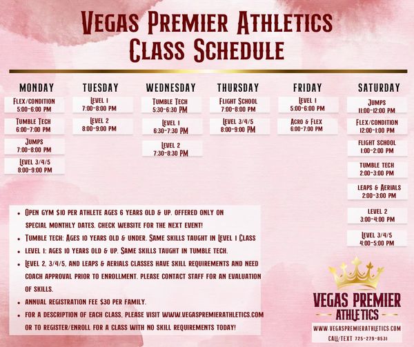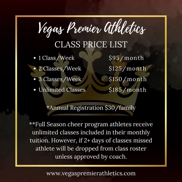 *Note that all athletes who are members of our cheer program receive unlimited classes within age requirement and skill level per week, at no additional cost!