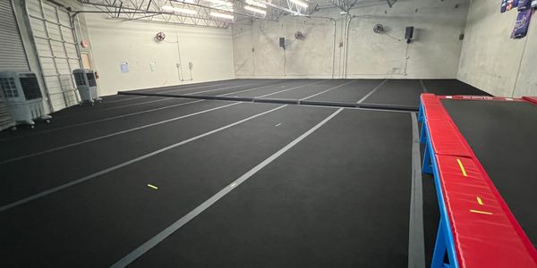 Our facility is almost 5000 sq. feet that features central air conditioning and swamp coolers, two restrooms, a stocked ProShop, and a welcoming lobby for families to relax while their athletes train. Our gym space will include brand new equipment such as a spring floor, dead mat space, 30 ft. tumble track, and every size mat needed to aid in each athletes skill progression.